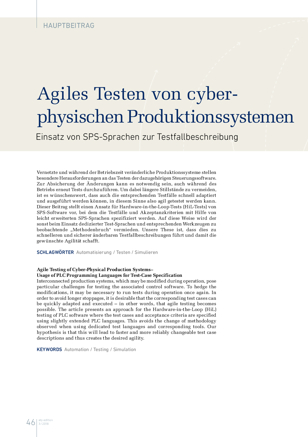 Vernetzte und während der Betriebszeit veränderliche Produktionssysteme stellen besondere Herausforderungen an das Testen der dazugehörigen Steuerungssoftware. Zur Absicherung der Änderungen kann es notwendig sein, auch während des Betriebs erneut Tests durchzuführen. Um dabei längere Stillstände zu vermeiden, ist es wünschenswert, dass auch die entsprechenden Testfälle schnell adaptiert und ausgeführt werden können, in diesem Sinne also agil getestet werden kann. Dieser Beitrag stellt einen Ansatz für Hardware-in-the-Loop-Tests (HiL-Tests) von SPS-Software vor, bei dem die Testfälle und Akzeptanzkriterien mit Hilfe von leicht erweiterten SPS-Sprachen spezifiziert werden. Auf diese Weise wird der sonst beim Einsatz dedizierter Test-Sprachen und entsprechenden Werkzeugen zu beobachtende „Methodenbruch“ vermieden. Unsere These ist, dass dies zu schnelleren und sicherer änderbaren Testfallbeschreibungen führt und damit die gewünschte Agilität schafft.