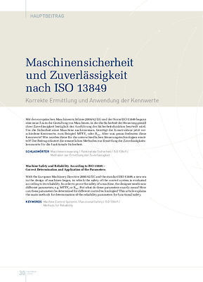 Mit der europäischen Maschinenrichtlinie 2006/42/EG und der Norm ISO 13849 begann eine neue Ära in der Gestaltung von Maschinen, in der die Sicherheit der Steuerung gemäß ihrer Zuverlässigkeit bezüglich der Ausführung der Sicherheitsfunktion beurteilt wird. Um die Sicherheit einer Maschine nachzuweisen, benötigt der Konstrukteur jetzt verschiedene Kennwerte, zum Beispiel MTTFd oder B10d. Aber was genau bedeuten diese Kennwerte? Wie werden diese für die unterschiedlichen Steuerungstechnologien ermittelt? Der textdata erläutert die wesentlichen Methoden zur Ermittlung der Zuverlässigkeitskennwerte für die funktionale Sicherheit.